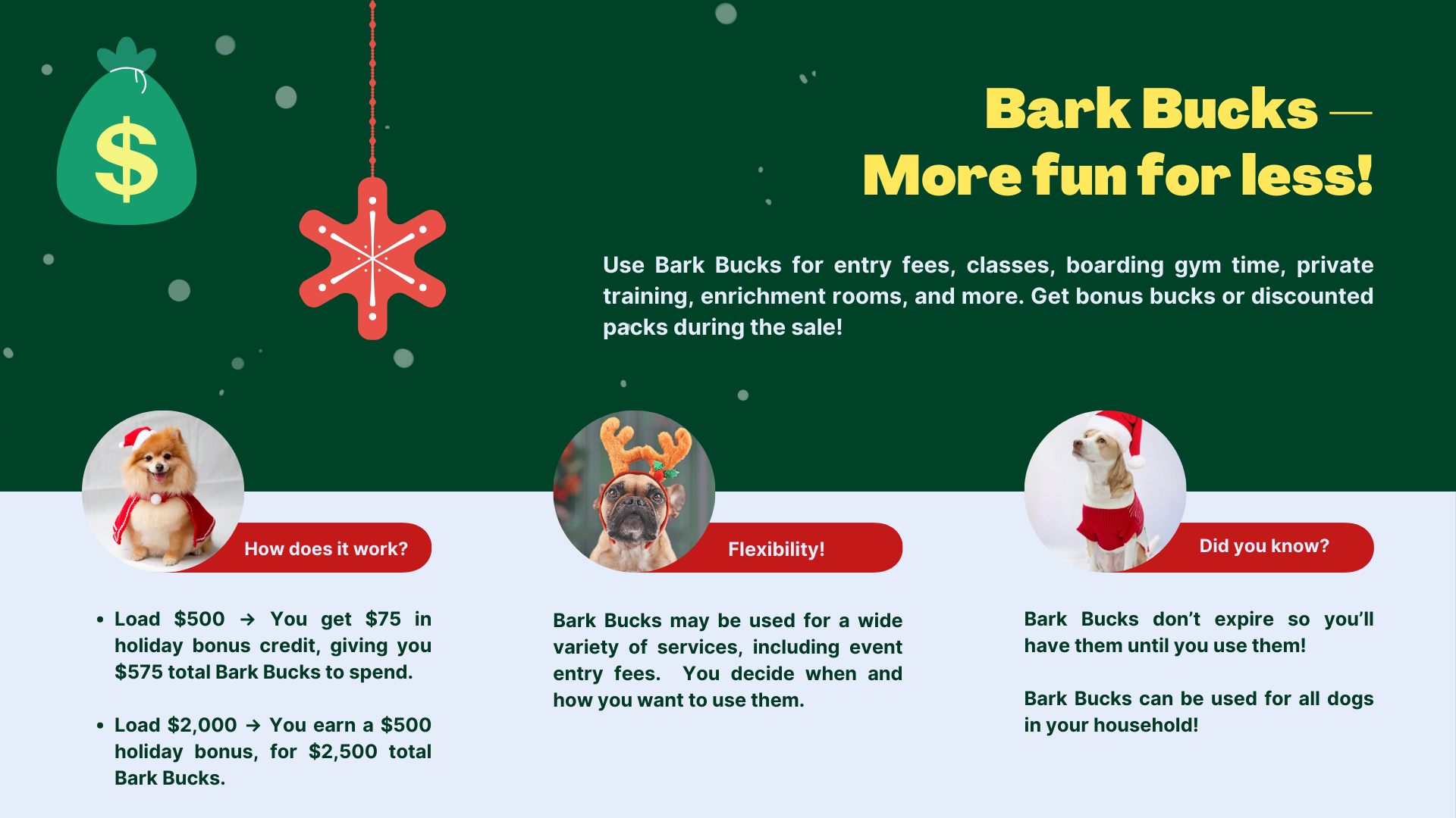 Load $7,500 β Get $3,000 bonus β Total: $10,500 Bark Bucks π (Holiday-only!)